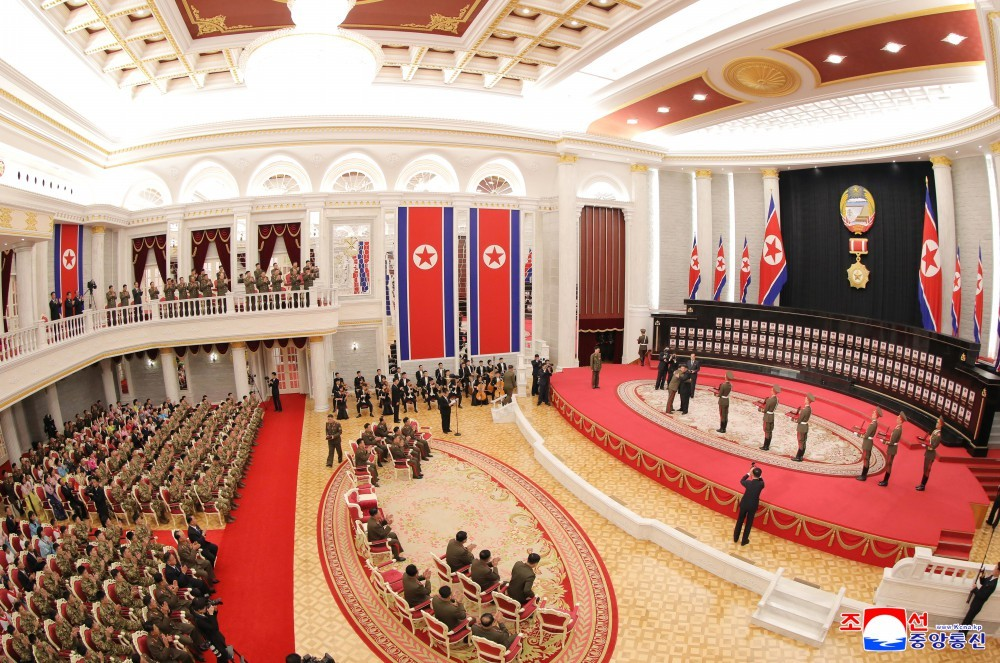 Зачитан указ Президиума ВНС КНДР о присвоении командному составу и бойцам, совершившим подвиги в зарубежной военной операции, звания Героя КНДР, орденов и медалей.